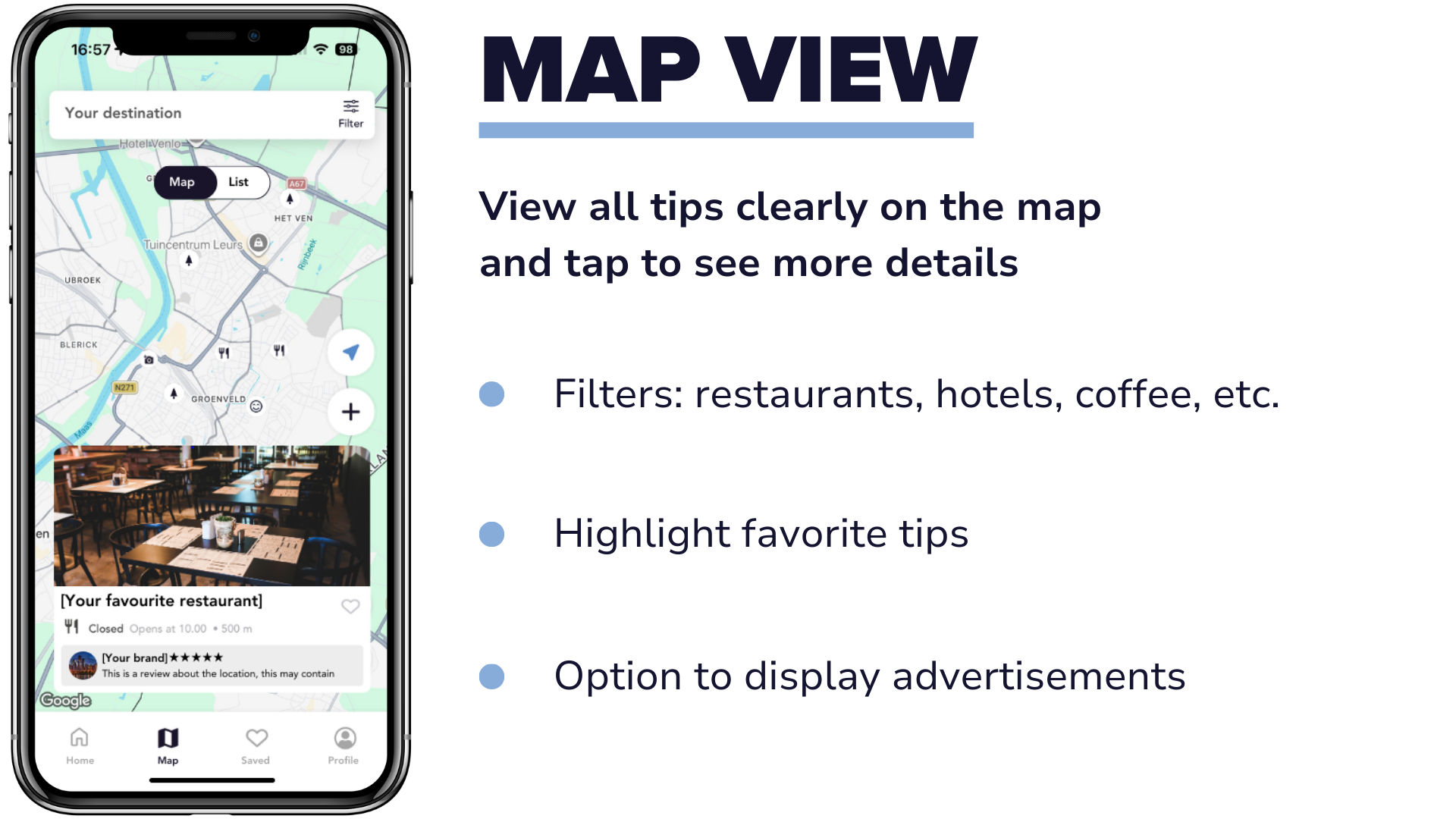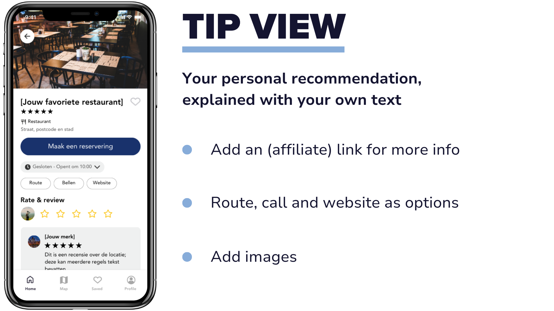 A GoHere app can be requested by organisations that want to provide their audience (travellers, customers or followers) with reliable tips and recommendations in their own branding. Think of travel organisations, city marketers, tourism organisations, content creators, hotels, expat communities, real estate agencies and other brands that want to inspire their audience with local tips.
